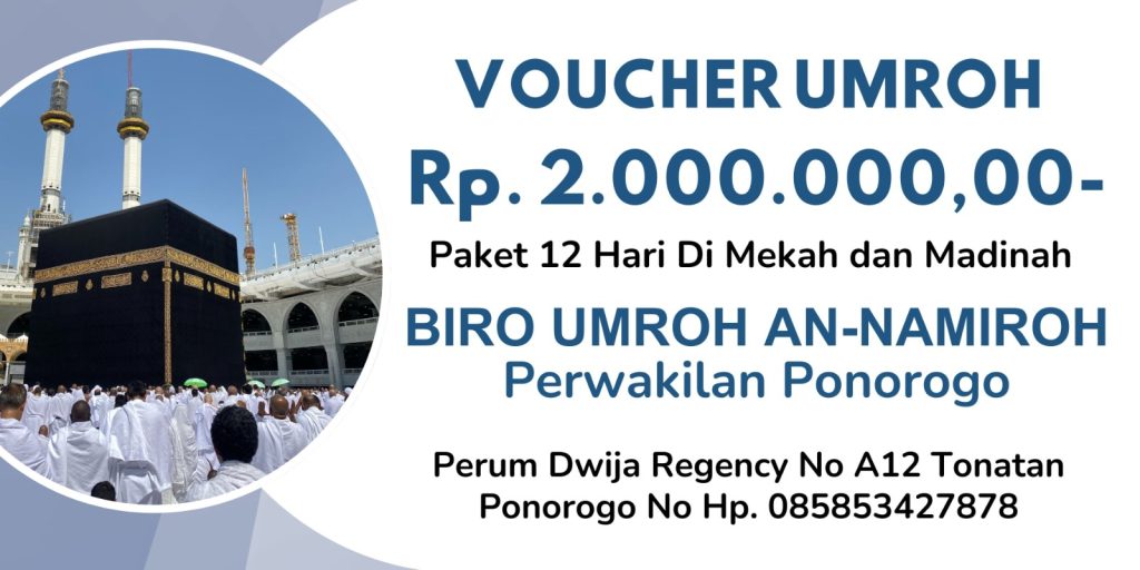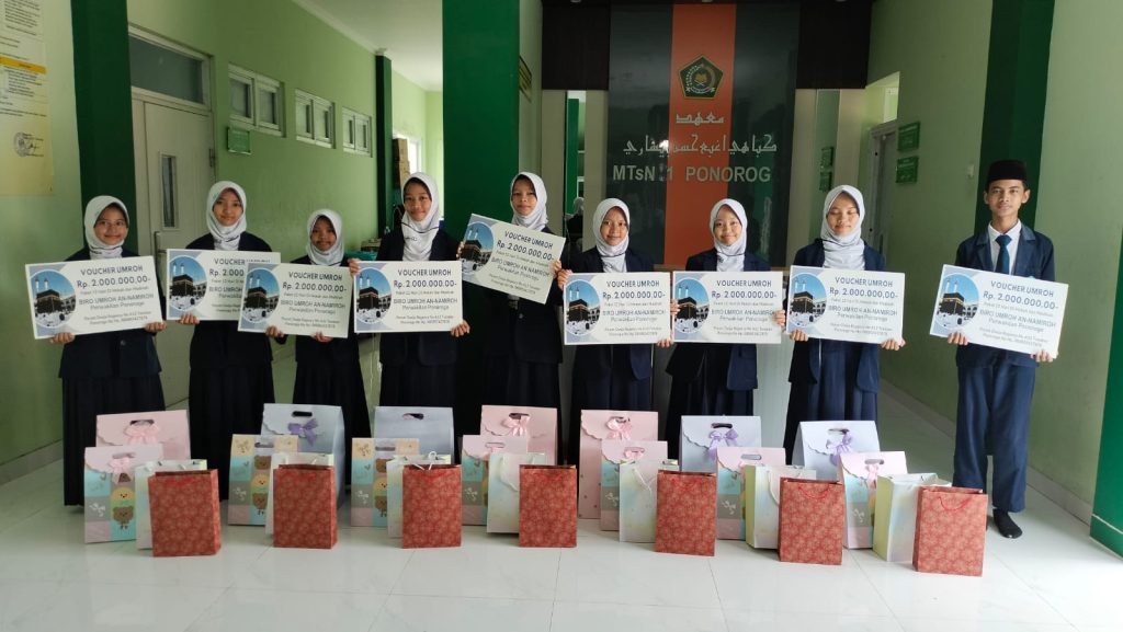 - 1 Voucher Umroh (paket 12 hari di Mekah dan Madinah) sebesar Rp 2.000.000,- dari Biro Umroh An Namiroh Perwakilan Ponorogo yg beralamat di Perum Dwija Regency No A12 Tonatan Ponorogo